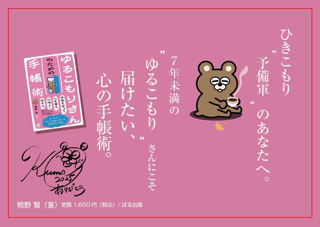 起業家・熊野賢氏が、延べ1万人へのひきこもり支援から生み出した新しいセルフケアの形を提案。自分軸を作る手帳術『ゆるこもりさんのための手帳術』(熊野 賢:著)が、ぱる出版より発売されます。
